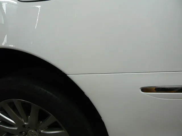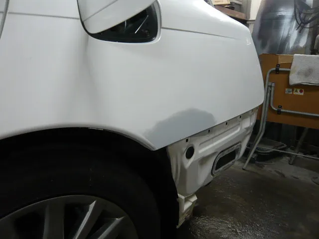 ホワイトパールに塗装し、磨き、バンパー、モール類を付けて完成となります^^ これぐらいの大きさの傷でも工期3~4日、金額は8~9万円程かかります。