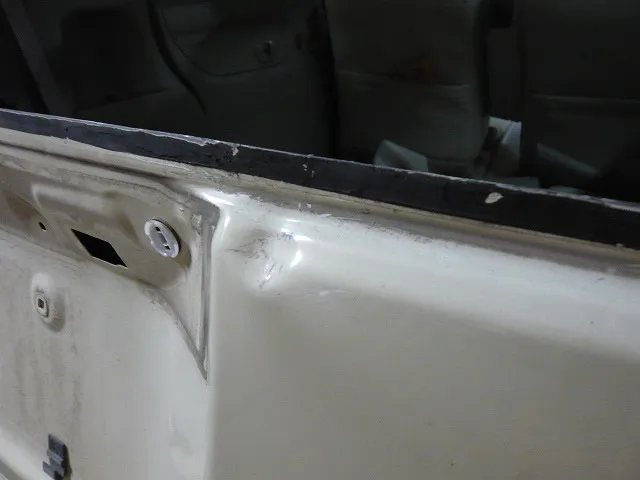 ガラスだけの破損と思いきや・・・リアゲートにも傷が(汗) ガラスが付く箇所なのでキチンと修正しましょう!!
