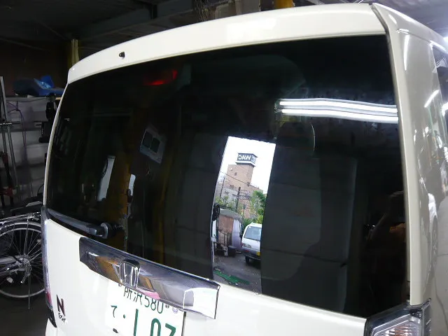 バックにて障害物に当たってしまい、リアドアガラスを破損してしまったホンダNBOXです(泣)