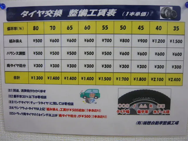 最近、タイヤお持ち込みのお客様が増えてきた事をふまえ、工賃表を一新しました!参考にして頂けるとありがたいです^^ 扁平率での区別となっております!よろしくお願いいたします^^;