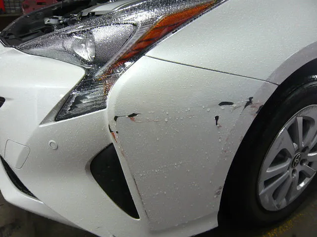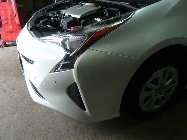 ポールに擦ってしまったプリウスです(泣) 写真ではわかりづらいですが、変形もしてしまいました(泣泣) 今回は新品へ交換です^^;