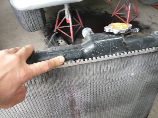 水漏れでのご来店、テリオスキッドです!水漏れというより、アッパータンク(人差し指の箇所)から噴水のように冷却水が溢れていました(汗) 純正新品よりお安い社外新品のラジエターに交換して無事納車となりました^^ ラジエターコア(社外新品)へ交換、LLC入れ替えで32400円となりました^^