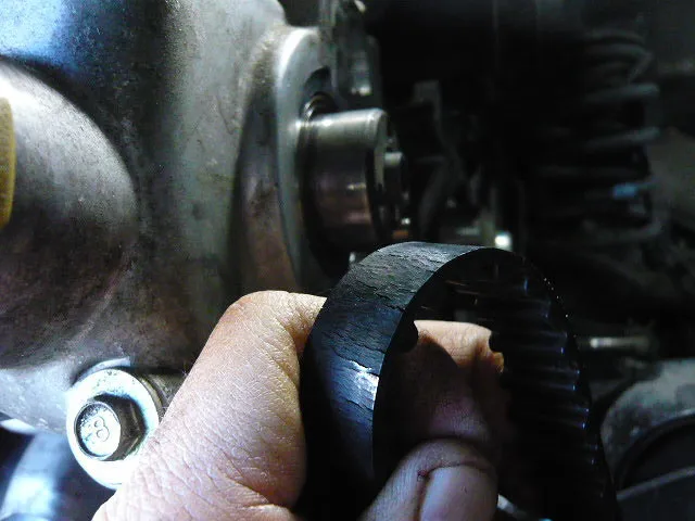 オイル漏れで入庫のサンバーバンです。オイル漏れの原因はクランクオイルシールでしたが、作業の為に外したタイミングベルトが。。(泣) 危ない所でした^^;; 一度交換しているらしいのですが、それから8万キロ走行なので仕方ないですね^^; 早めに気づいてよかったです^^ 今回、タイミングベルト、オイルシール、ウォーターポンプ、バルブカバーパッキン等々交換で40000円程の作業でした!ありがとうございました^^