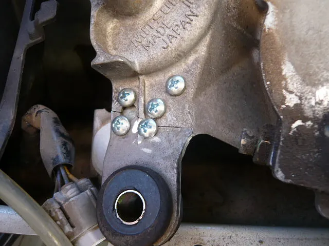 アッセンブリー交換すれば早いのですが、お値段が・・・(部品だけで15000円以上!!) ということで、鉄板をあてがい、ビス止めしました(材質アルミなので溶接も出来ません) がっちり5カ所! 見栄えは悪いですが、頑丈になりました^^ 安く上がったのでお客様に喜んで頂きました^^ 今回は8000円程の作業でした^^