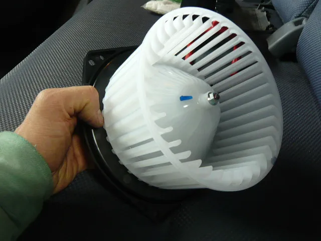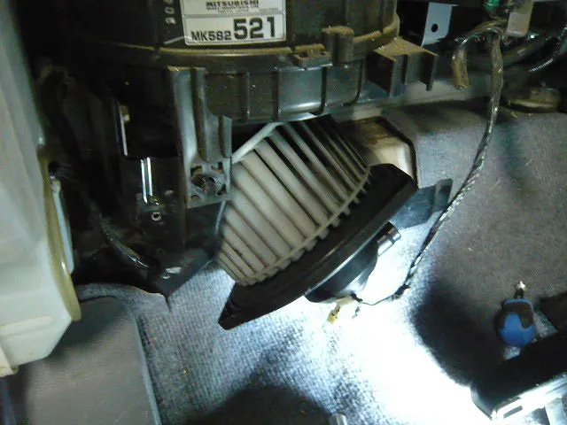 こちら新品のブロアモーターです^^ 綺麗に回りますよ!今回は写真のブロアモーターの他にコイル(レジスタコイル~風量調整しているコイルです)も同時交換させていただきました!締めて30000円程の作業となりました^^