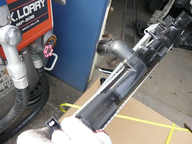 指先のロアタンクとコアの付け根辺りから冷却水の漏れを発見です!別の案件でも説明しましたが、今はラジエターアッセンブリーでの交換(新品)が主流ですので、この車両も新品へ交換です^^ 供給も早かったので即日納車できました^^¥ ラジエター交換、LLC入替、コンデンサー脱着&ACガスチャージで50000円の作業となりました^^