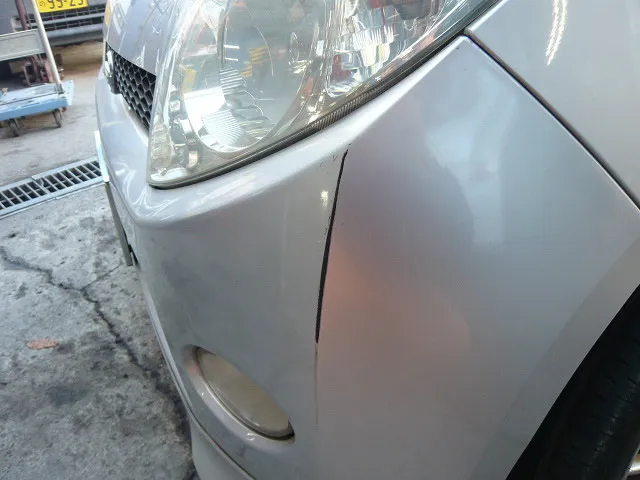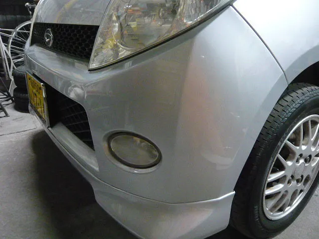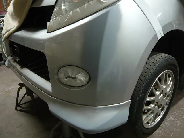 ダイハツマックスです。フロントバンパー左部分に傷があります(泣)幸いにもバンパー全体の歪みなどは無いため、今回は研ぎ&パテ(薄く)で修正します^^