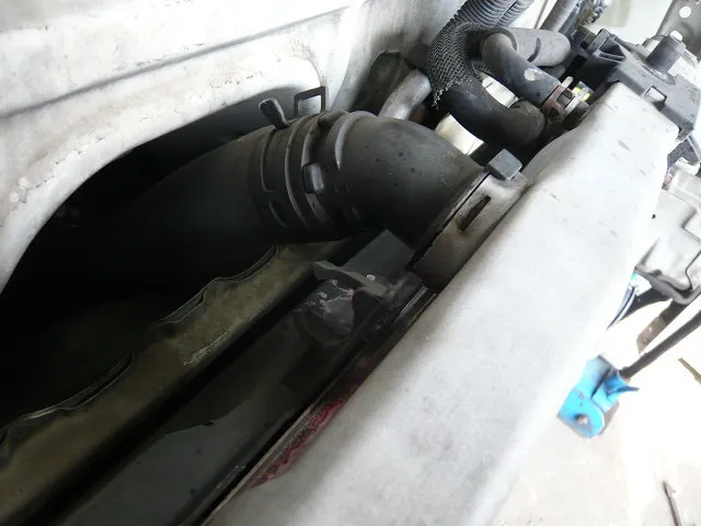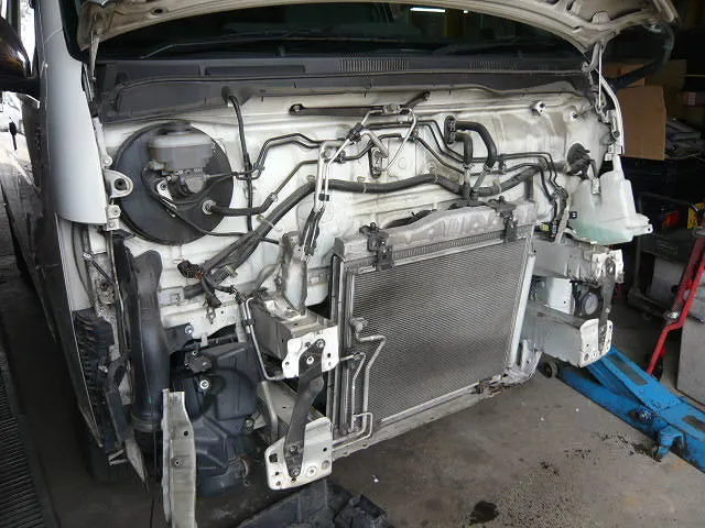 ちなみに、200系ハイエースは車両前部分をすべて外します^^:: ラジエターコアの前に付いているエアコンコンデンサーも外します^^ 慣れてれば、ここまで30分くらいでしょうか^^
