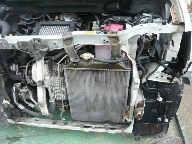オーバーヒート気味で入庫のダイハツムーヴ(L150S)ダイハツ車に多いのですが、「ラジエター」からの水漏れです^^;; アッパー部より漏れていましたー(割れてましたー)こうなると新品への交換となります(汗)18万キロ!仕方無いですね~今までよく頑張りました!ラジエター本体、LLC入替、ACコンデンサー脱着(ACガス入替)等々・・・80000円程の作業となりました。。
