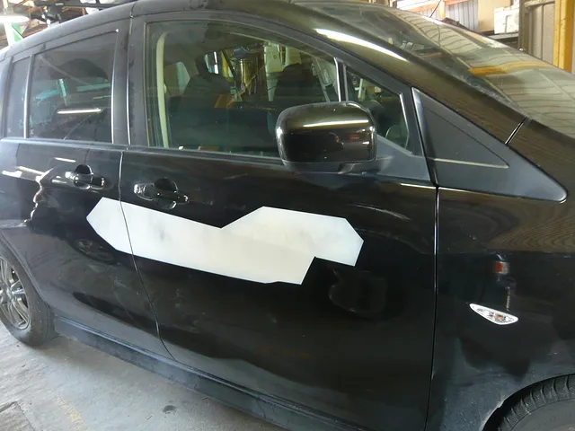 ニッサンラフェスタですが、イタズラで傷付けられてしまいました(泣) ひどい事です(怒)出来るだけ安く、しっかりと直したいと思います^^ 写真は傷を研磨し、サーフェーサーを吹いたところです!!