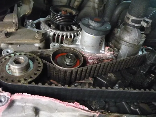 オイル漏れでのご入庫ですが、点検した結果、ウォーターポンプからの水漏れも発見! オイル漏れの原因はオイルエレメントのベース(ダイハツ車ではよくあるのですが、エンジンブロックとオイルエレメントの間にベースがあってそのOリングからオイルが滲むのです)。ついでにタイミングベルトも交換させていただきました^^