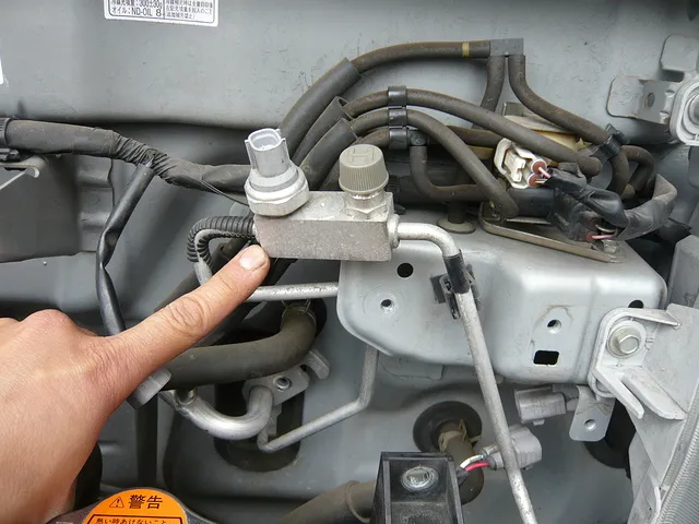 ダイハツハイゼットバンですが、エアコンONOFFを激しく繰り返す(カチカチ)為に入庫されました!ハイゼットでは、もはやお約束なのでしょうか?指の先のパイプが原因です(汗)
