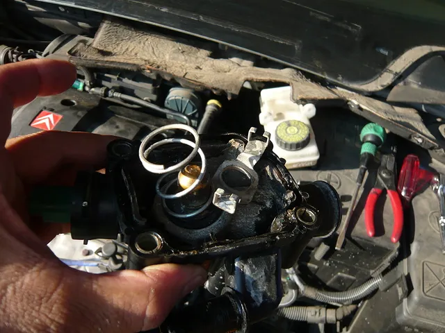 当社にレッカー移動されてきたシトロエンC4です。水漏れですが、某ディーラーさんで「ホースからの漏れです!」と言われ、一応当社で点検・・・水を入れるとダダ漏れ(泣) 点検をすすめていくと黒いケースからの漏れを発見!! 外してみると、バラバラのサーモスタッドが落ちてきました(汗) 国産車では見られませんが、サーモスタッドが壊れての水漏れだったようです!