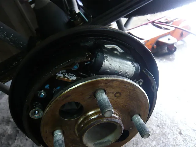 ブレーキ警告灯が点灯している!ということで点検です。フロントブレーキパット異常なし!リヤは?ライニングは異常なしですが、ホイールシリンダーからフルードが漏れていました(泣)