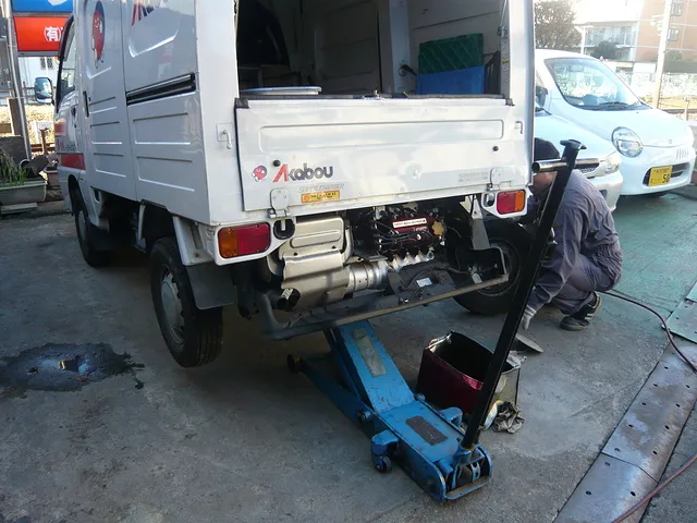 赤帽サンバーのオイル交換です!32万キロ突破^^ 頑張りましょう^^