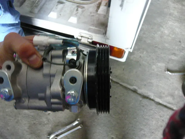 暑くなってきましたね。エアコンが必要な時期ですが、ぬるい風しか出なくなってしまったサンバーです。各部点検(ヒューズ、スイッチ、導通など)した結果、コンプレッサー本体がダメでした(泣) リビルト品に交換後、ガス入れ(真空引き)し、無事冷えるようになりました^^